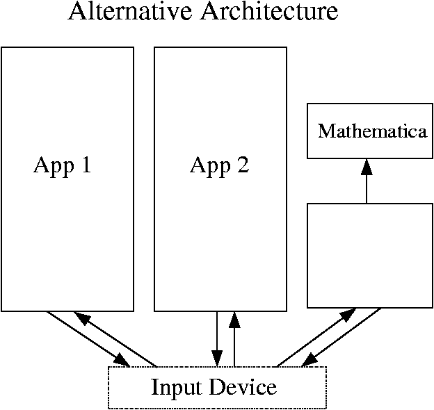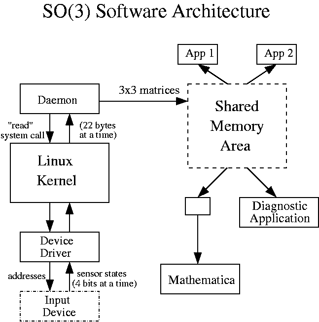 The SO(3) Input Device is designed to provide users with an intuitive means to control the perspective on three dimensional objects displayed on a computer screen. I currently have a patent pending on this device and associated methods. (Wish me luck.) I built a prototype and coded the necessary software in the summer of 1999. This project could be used as a basis for case studies in both hardware and software architecture. (It also could be [and in fact has been] used as the basis of a mathematical talk which highlights the use of geometry, topology and linear algebra in the software algorithms used to interpret the raw data read from the device.) We are going to focus on the various software components needed to make the device usable. In particular we will examine the interactions amongst the OS kernel, the device driver, the device daemon and applications which use data derived from the device. The following diagram gives an overview of these interactions.